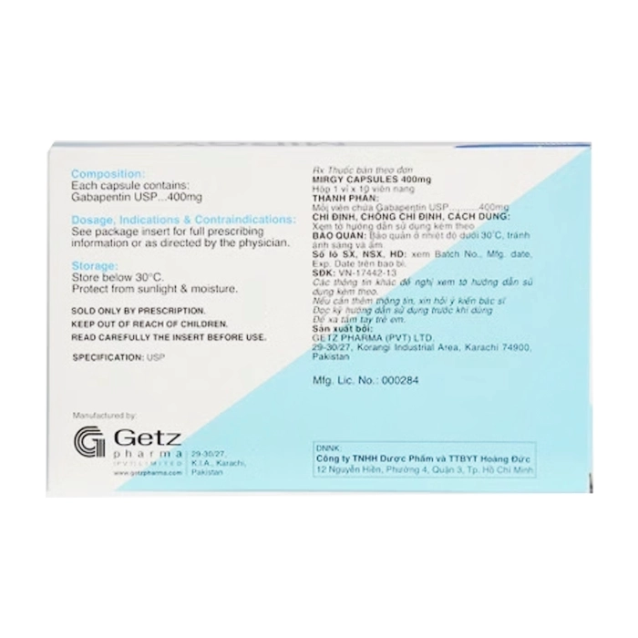 Mirgy 400mg Getz Pharma 1 vỉ x 10 viên (Gabapentin)