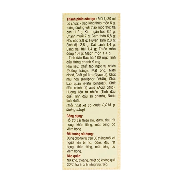 - Hỗ trợ cải thiện ho, đờm, đau rát họng, khản tiếng, mất tiếng do viêm họng.